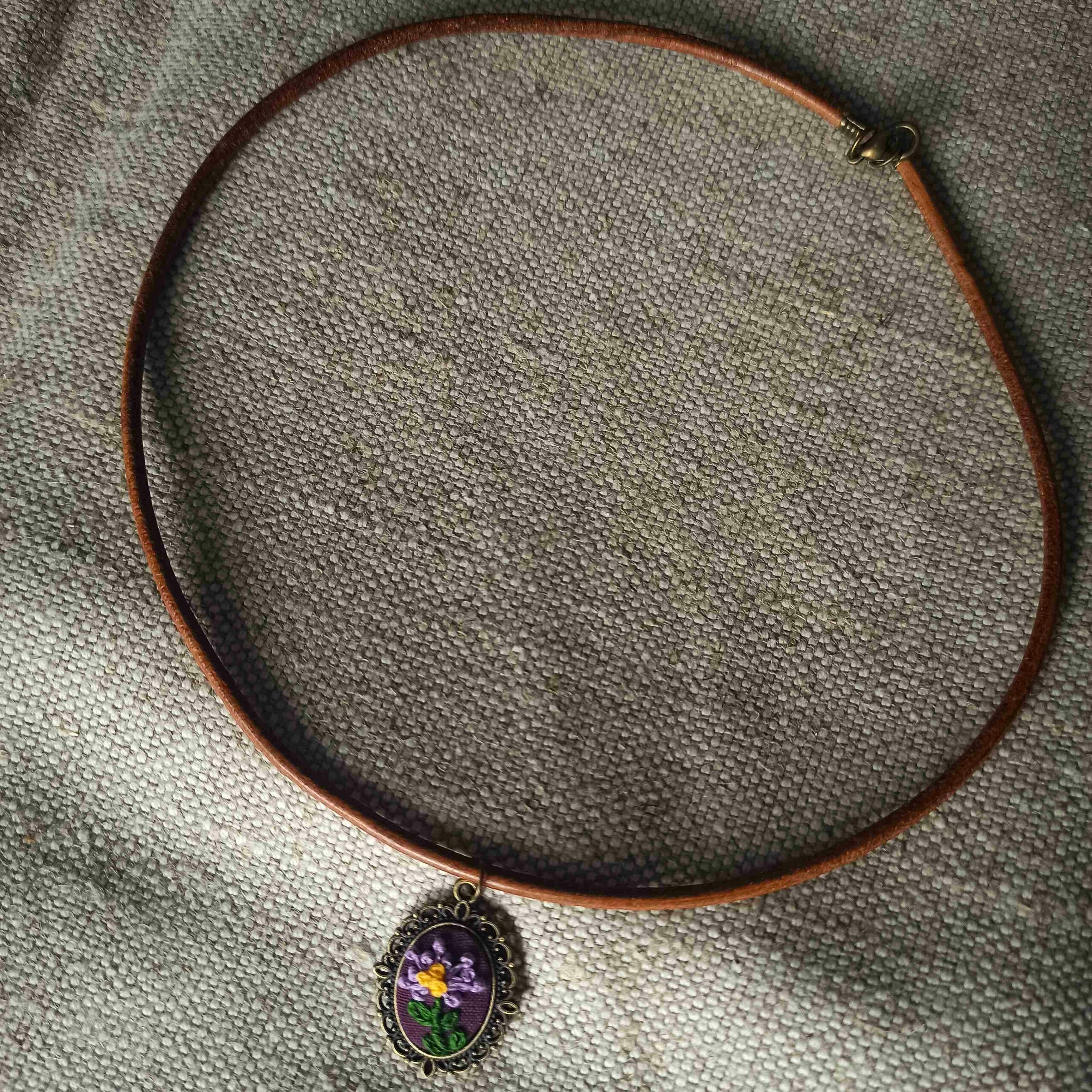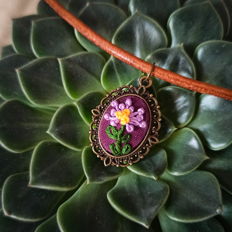 Kwiat wystaje około 1,5 mm ponad powierzchnię tkaniny, na której jest wyszyty. A to dzięki użyciu węzełków francuskich, których użyłam do wykonania płatków oraz pręcików kwiatowych. W rezultacie uzyskałam efekt trójwymiarowości. Natomiast owalną bazę wisiorka dobrałam w pasującym kolorze brązu / starego złota z ozdobnymi detalami. Cały haft wykonałam bawełnianymi mulinami firmy Ariadna na lnianym materiale w kolorze delikatnie ciemnego fioletu.